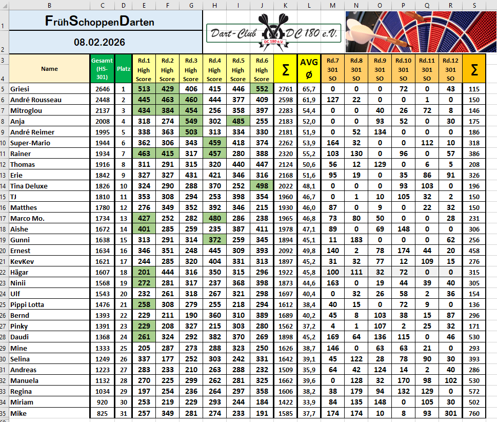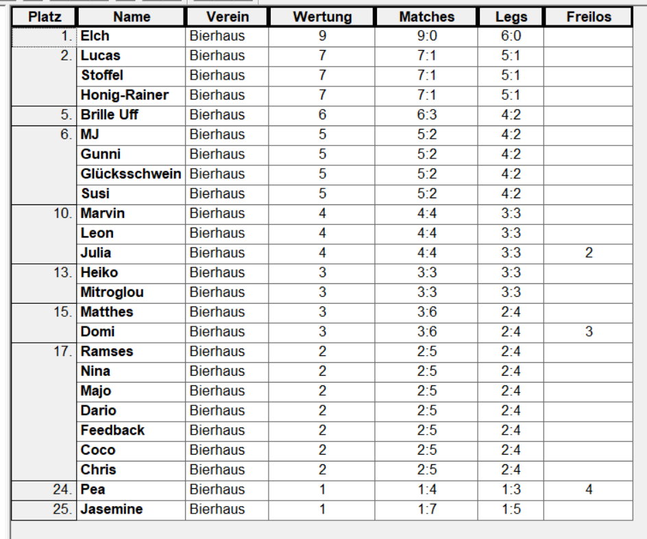 Pro Leg gibt es folgende Wertungspunkte: Sieg = 5 Punkte / 2.Platz = 3 Punkte / 3.Platz = 1 Punkt. Sollten der 2. und 3.Platz dieselbe Restpunktzahl haben, dann erhalten beide Spieler 2 Punkte. Es wurden insgesamt 9 Runden gespielt.
