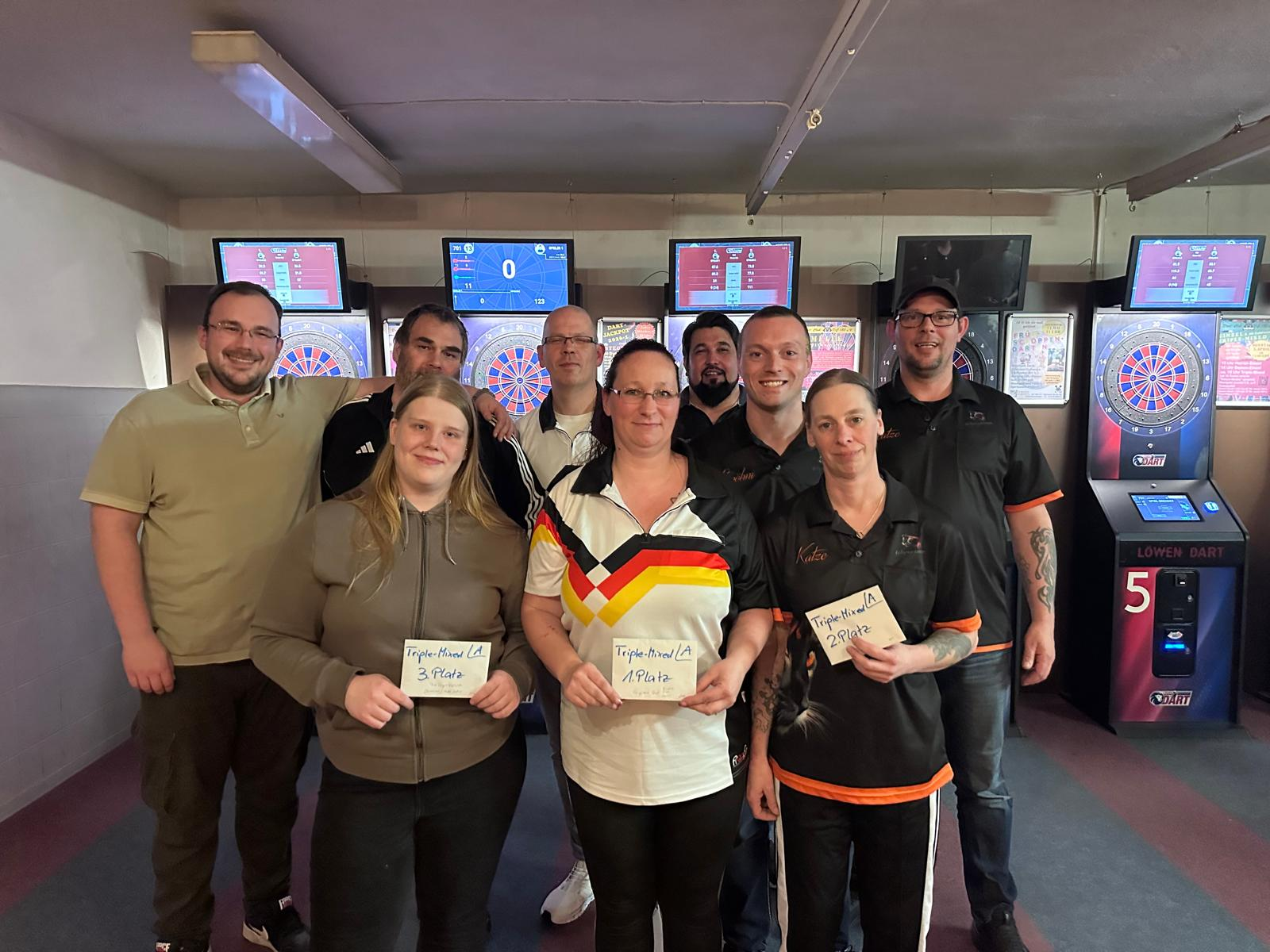 Triple-Mixed Endrunde A v.l.n.r.: 3.Platz Die Tages-Vollsten: André & Uller & Jasemine / 1.Platz Surpreme Shot: Nicole & Rob & Halil / 2.Platz: Katzengejammer: Spöhni & Katze & Matze