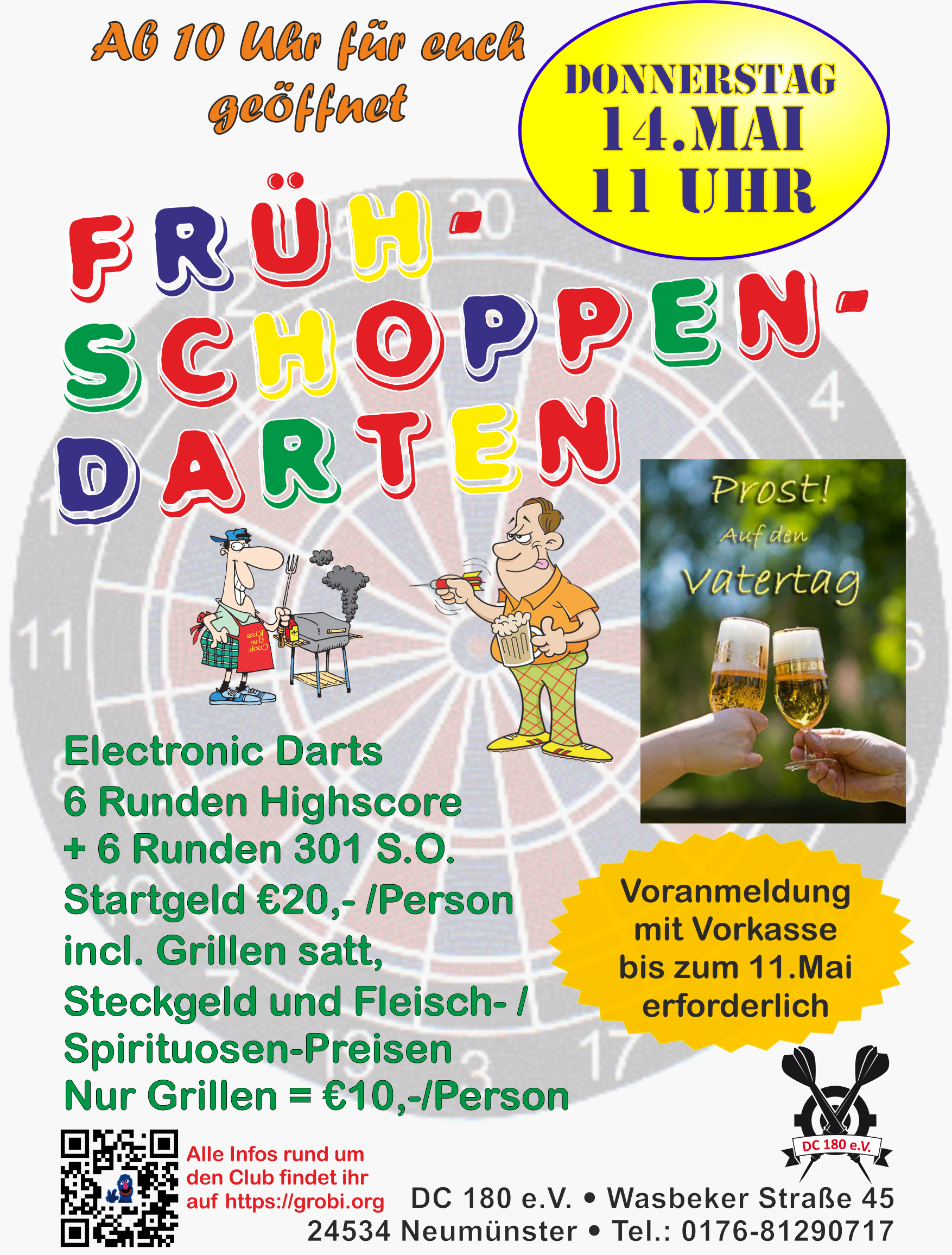 FRÜHSCHOPPEN-DARTEN am VATERTAG Veröffentlicht 6. April 2026 · Aktualisiert 10. April 2026 FRÜHSCHOPPEN-DARTEN am VATERTAG 11:00 – 17:00Do. 14. Mai 2026 iCal GoogleKompletten Kalender ansehen